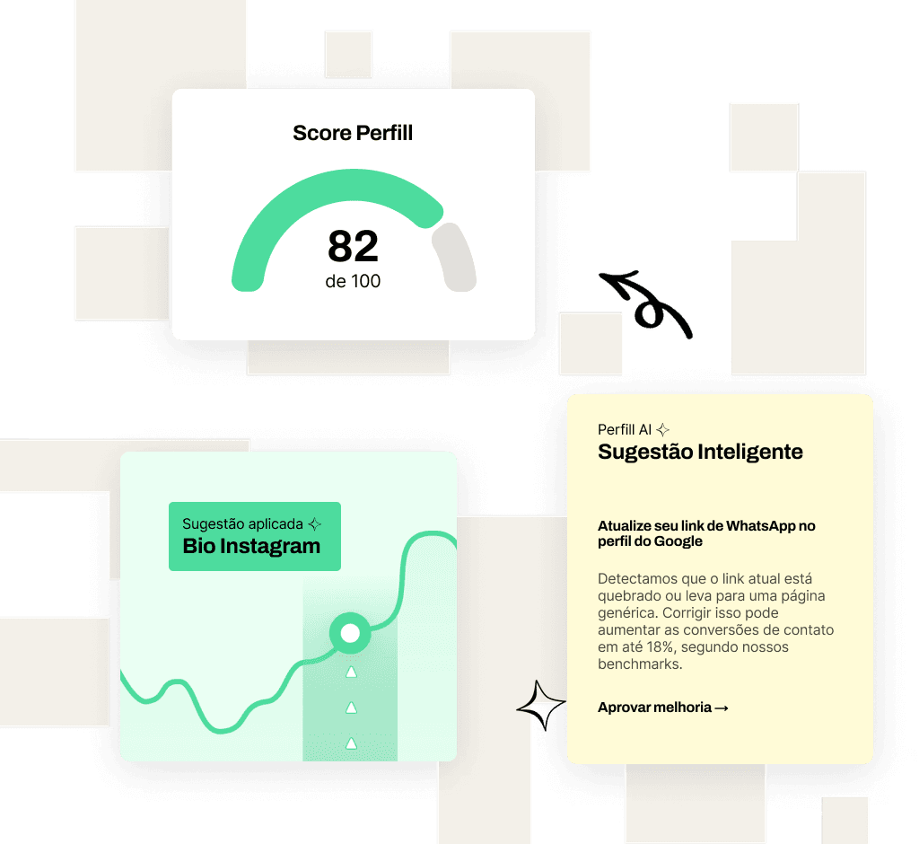 Aprove sugestões com um clique, aumente seu score e veja o impacto direto nas suas conversões e visibilidade online.